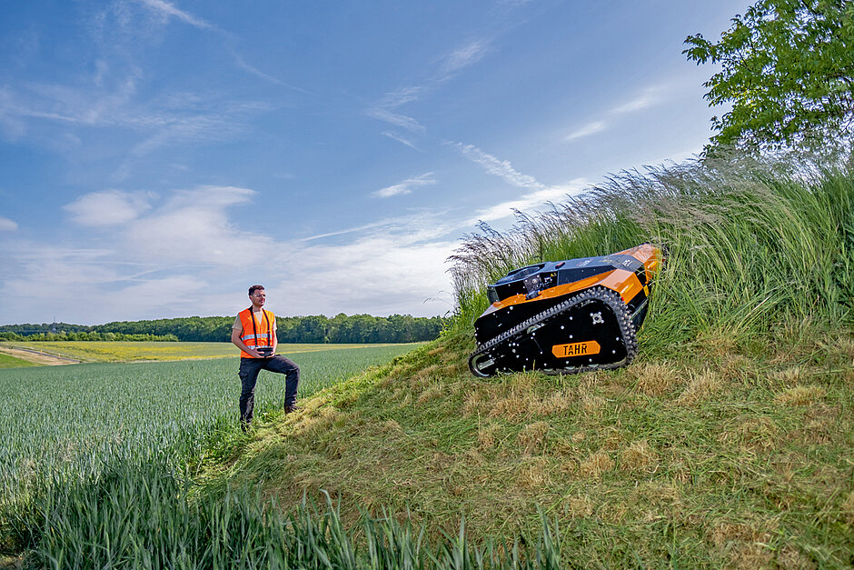 Der neue »AS 990 Tahr RC« kennt beim Mähen kein klassisches »Vorwärts« oder »Rückwärts«. Zeitraubendes Wenden nach jeder Bahn ist laut AS-Motor nicht nötig. Sein beidseitig offenes Sichelmähwerk ermöglicht einen sauberen Schnitt in beide Fahrtrichtungen. Auch die Schnittgutablage erfolgt immer im gleichen Muster. So ergibt sich ein durchgängig einheitliches und sauberes Schnittbild, auch auf rasenähnlichen Flächen. Das Kreuzmessersystem, welches auch im »AS 940 Sherpa«-Aufsitzmäher verbaut ist, überzeugt laut Unternehmen durch seine hohe Schnittkraft. Bis zu 1,5 m hohes Gras und Gestrüpp werden von zwei Pendelklingen mit hoher Geschwindigkeit problemlos geschnitten und vom darüberliegenden Messerbalken zerkleinert. Die großflächige Ablage des Mähguts erleichtert dessen schnelles Zersetzen.