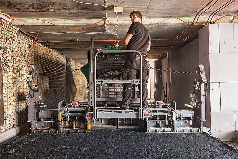 Der Super 800-3i erwies sich als maßgeschneidert für diese Baustelle. Als besonders vorteilhaft, neben der geringen Maschinenhöhe von nur 1,98 m erwies sich dabei auch die Bedienplattform Ergo Basic. Der Fahrer steht hoch genug für eine perfekte Rundumsicht. Aber noch immer so niedrig, dass er den Einbau in niedrigen Räumen aufrecht stehend steuern kann. Zudem erlaubt das durchdachte Maschinendesign das maschinelle Fertigen bis 5 cm an seitliche Begrenzungen. Für das rückwärtige Ansetzen an Mauern wird der hintere Tritt an der Bohle einfach hochgeklappt. Manuelle Nacharbeiten sind somit kaum mehr nötig. Helge Kubsky, Fertigerfahrer bei Konrad Bau aus Lauda-Königshofen, lobt noch ein weiteres smartes Detail: »Bei Einbauarbeiten unter Dächern sind die Sichtverhältnisse oft schlecht. Hier hat Vögele mit der integrierten Hintergrundbeleuchtung der ErgoBasic-Bedienkonsole perfekt mitgedacht.«