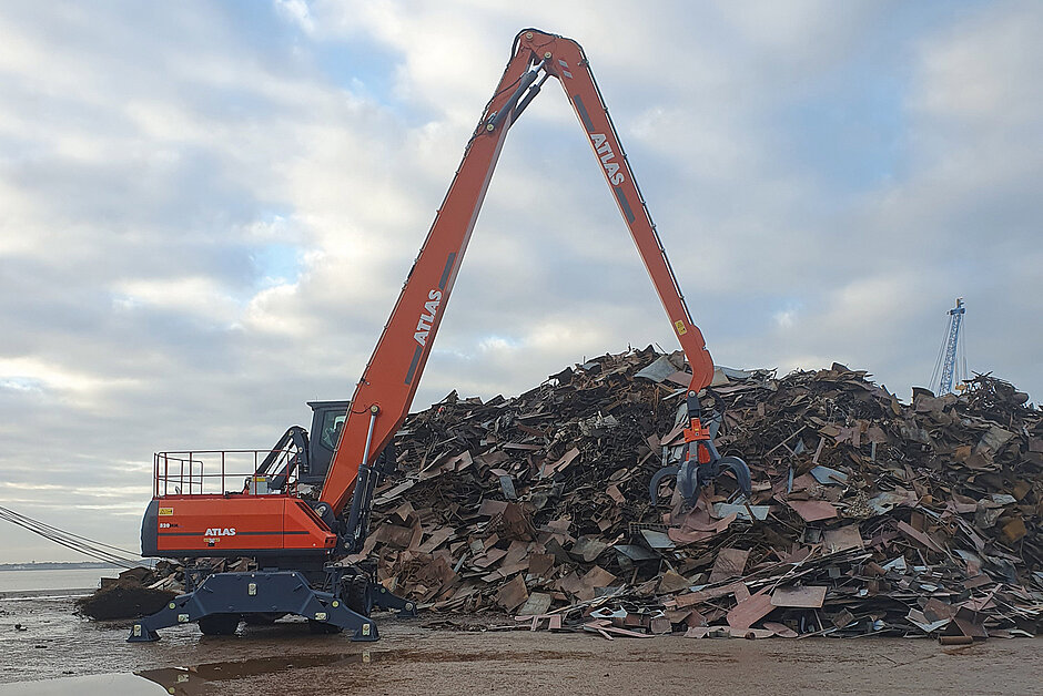 Die Kabine ist mit einer serienmäßigen Klimaanlage ausgerüstet. Auch je eine Rückraum- bzw. Seitenkamera rechts gehören serienmäßig dazu. Besonders wichtig ist, dass es in der Kabine leise ist. Sie ist so konstruiert, dass nur 70 dB(A) Schall in der Kabine gemessen werden. Ein kontraststarkes Display, digital oder per Direktbefehl steuerbar, Komfortfahrersitz sowie beste Sicht aufs Arbeitsfeld machen aus der Kabine einen Wohlfühlraum. Der Unterwagen ist mit Schwerlast-Spezialbaggerachsen ausgerüstet. Die Lenkachse hat eine automatische Pendelachsblockierung. Abstützpratzen und Kabinenaufstieg sind neu konzipiert worden. Mehr Sicherheit und ein einfacherer Einstieg für den Fahrer war der Leitgedanke. Hier in St. Nazaire wird der Atlas 5-Schalengreifer E851 genutzt. Er kann mit einem Griff 700 l Altmetall fassen. »Dadurch, dass wir von Atlas in der Lage sind, detailliert und schnell auf Kundenwünsche einzugehen, sowohl was Konstruktion als auch was Fertigung betrifft, entsteht eine konsequent unter Qualitätsaspekten individuell gefertigte Maschine aus einem Guss. Das bringt wirtschaftliche Vorteile und macht uns auf dem Markt einzigartig«, erklärt Brahim Stitou, Geschäftsführer der Atlas GmbH.