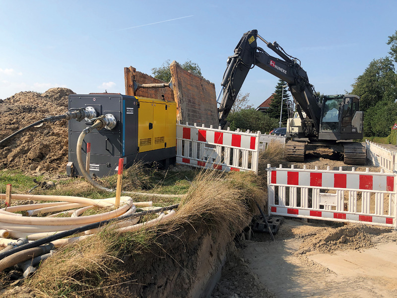 Die trocken ansaugenden Pumpen der PAS-Reihe – das bauMAGAZIN-Titelbild zeigt das Modell PAS 150 im Praxiseinsatz – sind auf eine hohe Leistung unter vielfältigen Bedingungen ausgelegt. Sie bestehen aus einem Luftabscheider und einer Vakuumpumpe und beginnen rasch und automatisch mit dem Ansaugen. Auch bei Saughöhen von mehreren Metern sind sie in der Lage, die Saugleitung schnell zu entlüften und mit dem Pumpen zu beginnen. Durch das halboffene Laufrad eignen sich die Pumpen der PAS-Reihe außerdem für das Pumpen von Flüssigkeiten mit Feststoffen in Suspension.