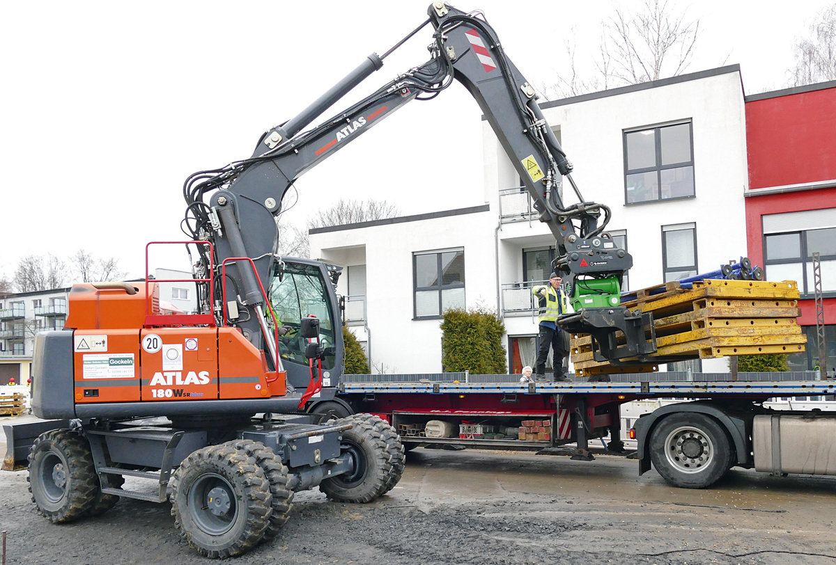 Aufgrund von Kurzheck und Tiltrotator eignet sich der Atlas-Mobilbagger 180 WSR ideal für Baustellen auf beengtem Raum. Gleichzeitig soll der 21 t schwere Bagger als Kraftpaket im Straßen- und Tiefbau mit hoher Standfestigkeit punkten.