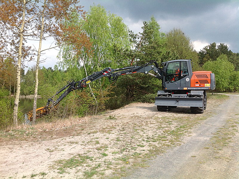 Ein weiteres Alleinstellungsmerkmal des neuen Atlas Big Foot ist die dünne Konstruktion des Arms und dessen Montage mittig auf dem Oberwagen, über dem Drehkranz. Aufgrund dieser Anordnung ergibt sich eine gleichmäßige Verteilung der Belastung und somit die ausgeglichene Gewichtsverteilung der Räder. Auch bei Verlängerung durch einen zweiten Knickarm (»Löffelstiel«), inklusive Mähkorb oder Schaufel (2,15 m zusätzlicher Länge) soll der Big Foot nicht ins Wanken kommen. Damit sollte selbst das Arbeiten querab und bis zu einer Reichweite von 11,5 m beziehungsweise 12 m kein Problem sein – obwohl hierbei die mit Abstand höchsten Traglasten erreicht werden. Der neue Atlas Big Foot stehe und arbeite, so der Hersteller, selbst auf instabilen Untergründen geradezu unerschütterlich. Unterstützt werde dies von einer außergewöhnlich feinfühligen Hydraulik.