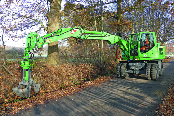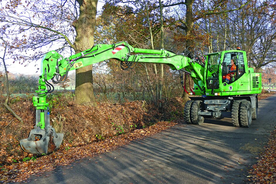 Der Atlas 160 WSR kann mit Verstellausleger, bei einer Stiellänge von 2,65 m, bis zu 9,3 m weit reichen – ein Vorteil, wenn man über eine Fahrbahn hinweg oder in weit entfernten Grabenbereichen arbeiten muss. Ausgerüstet ist er mit verschiedenen Löffeln, einem Sortiergreifer und einem Zweischalengreifer. Der vollhydraulische Schnellwechsler gehört auch zur Ausrüstung des Mobilbaggers. Eine solide Standfestigkeit ist bei der großen Reichweite von hoher Wichtigkeit. Deshalb hat man die Reifen ausschäumen lassen. Mittlerweile hat der 160 WSR rund 400 Betriebsstunden hinter sich und auf dem Betriebshof in Norderstedt bestätigt sich die Richtigkeit dieser Investition. »Unser Mobilbagger hat sich bei seinen bisherigen Einsätzen wirklich sehr gut bewährt«, so Kühl.