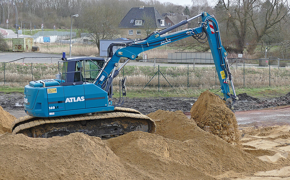 Danach wird der kontaminierte Bodensatz ausgehoben, der mit Spezialfahrzeugen abtransportiert wird. Hierfür nutzt der Atlas 160 LC verschiedene Löffel von 0,5 m³ und bis zu 3 m Breite. Unterstützt wird Jürgen Ecks durch den Händler Atlas von der Wehl aus Lauenbrück und Atlas Hamburg. Über die Händler können Baggertypen nach den Kundenwünschen konstruiert und umgebaut werden. So wie eben das Atlas-19-t-Modell 160 LC, das in Lauenbrück umgebaut wurde. t