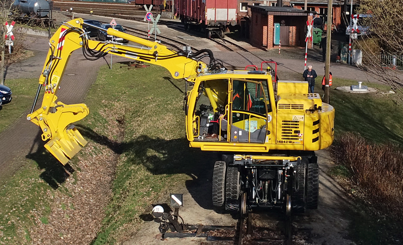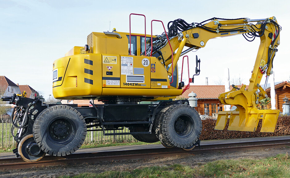 Das Kontergewicht ist beim Atlas 1404 ZW integriert, lieferbar ist der Zweiwegebagger in den drei Heckradiusvarianten 1 575 mm, 1 700 mm und 1 998 mm. Ein niedriger Schwerpunkt und ein quer eingebauter Motor dienen einer optimierten Stabilität und Standsicherheit beim Arbeiten auf dem Gleis. Das Fahrwerk mit speziell konzipierten Baggerachsen mit Planetengetriebe in allen vier Radnaben sowie Allradantrieb, Regelfahrmotor mit Lastschaltgetriebe und ein doppelt wirkendes Fahrbremsventil sind Weiterentwicklungen. Die hingegen neu konzipierte Starrachse verfügt über ein zuschaltbares, 100 %-iges Sperrdifferenzial. Der Zweiwegebagger kann mit AWE-4-Technik über Spurräder oder mit Reibrad angetrieben werden. Der Unterwagen ist auf jedes Schienensystem anpassbar.