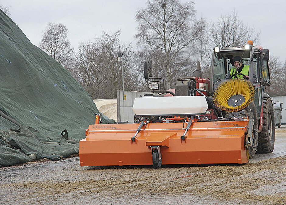 Auf einer Biogasanlage der Ökoenergie Recke beseitigt die neue Anbaukehrmaschine beispielsweise jedes Kehrgut wie Mais- und Grassilage, Festmist oder auch Getreide. Diese Produkte verwendet die Biogasanlage zum Vergären. Dabei entstehen rund 20 Mio. kWh Strom im Jahr sowie 22 Mio. kWh Wärme pro Jahr. Franz Lührmann, Verantwortlicher für die Biogasanlage in Recke, ist beeindruckt von der Power der neuen Kehrmaschine. »Wir benötigen täglich über eine Stunde für die Reinigung der Freiflächen«, so Lührmann. »Die bema 75 Dual Power-Master erleichtert uns die Arbeit enorm, indem wir durch den großen Durchmesser des Besens mit nur einer Überfahrt das Pflaster sauber bekommen.« Auch der Seitenbesen erspart den Arbeitern einige Stunden Arbeit in der Woche.So muss keiner der Arbeiter vor der Kehrmaschine herlaufen und die Kanten von Hand zur Mitte fegen. Extra große Laufräder (Durchmesser 360 x 85 mm) mit schweren stabilen Gussradkörpern und hochwertigen Elastik-Vollgummireifen, die abschmierbar und doppelt gelagert sind, meistern das unebene Terrain, was auf der Biogasanlage vorherrscht, mühelos. Ein weiterer Pluspunkt der bema 75 Dual Power-Master ist laut Lührmann der stabile Rahmen. Dieser kann dem Druck des Trägerfahrzeuges gut standhalten. »Auch wenn man mal versehentlich etwas zu viel drückt«, so Lührmann. Lührmann erklärt auch die Bedeutung der großen hydraulischen Kupplungen, die die bema 75 Dual Power-Master vorweist. »Es ist wichtig, dass die Kupplungen viel Öl durchlassen. Es nützt nichts, wenn die Schläuche 100 % Öl durchlassen, die Kupplungen aber nur 50 %.«