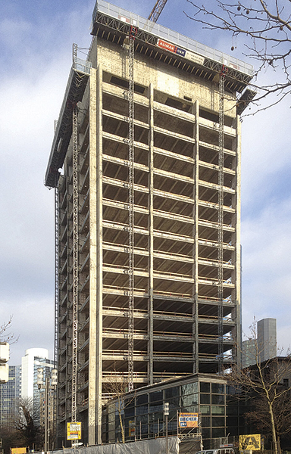 Nach der kompletten Entkernung samt Fassadenrückbau ging es in die nächste Etappe des Revitalisierungsprozesses; auch diesen Schritt begleiteten die mastgeführten Kletterbühnen von Alimak Hek – eingesetzt vom nächsten Unternehmen, zuständig für den Rück- und Neubau der Technikgeschosse. Ausgestattet mit erhöhten Geländern und Sonderverbreiterungen für die etwas zurückspringende Fassade der Technikgeschosse, sorgten die zu umlaufenden Schutzbühnen umgebauten mastgeführten Kletterbühnen aus niederländischer Produktion für die Absturzsicherung während des Rückbaus. Mit an der Fassade anliegenden Dichtlippen versehen, war bei diesen Arbeiten sichergestellt, dass Kleinteile bzw. während der Abbrucharbeiten anfallende Absplitterungen oder Schutt größtenteils auf den Plattformen landeten und somit keine Gefährdung für Passanten am Boden bedeuteten. Im Lauf des Rückbaus begleiteten die Mastkletterbühnen die Demontage der oberen Stockwerke und wanderten mit dem Abbruch-Takt nach unten, bis die »alten« Technikgeschosse verschwunden waren. Direkt im Anschluss kletterten die HEK MSM Super zur Unterstützung des Aufbaus der Stahlkonstruktion für die entstehende offene Panorama-Etage und des Konferenzbereichs Schritt für Schritt wieder nach oben. »Alle Umbauten und Anpassungen der mastgeführten Kletterbühnen, die Demontagen und Aufstockungen der Maststränge während des Rück- und Neubaus sowie Auslegung und Anbringung von Sonder- und Sturmverankerungen hat Alimak Hek komplett übernommen und die sicherheitsrelevanten Schnittstellen statisch nachgewiesen«, erklärt Poddig. Mit moderner 3D-CAD-Software entstehen die individuellen Höhenzugangslösungen von Alimak Hek vorab virtuell am Computer; anschließend werden diese vor Ort entsprechend umgesetzt. Während der Arbeiten an der T11 kam auch ein Einzelkabiner Alimak Scando 450 zum Einsatz; die leuchtend orangefarbenen Bauaufzüge aus ISO-zertifizierter schwedischer Herstellung sorgen auch in Frankfurt für komfortable Beförderung von Mensch und Material. Mit Geschwindigkeiten von bis zu 54 m/min befördert der »kleine Bruder« des Alimak Scando 650, je nach Konfiguration bis 2 000 kg Nutzlast in die Höhe, die frequenzgeregelte Motorensteuerung ermöglicht weiches Anfahren und Stoppen und sorgt so für geringen Verschleiß.