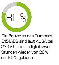 Der D151AEG ist der erste AUSA-E-Dumper mit 1,5 t Ladekapazität. Er ist mit einem 7,6 kW starken Elektromotor und einer Spitzenleistung von 17,3 kW sowie permanentem Allradantrieb mit hoher Geländegängigkeit ausgestattet. Um mindestens einen typischen Arbeitstag eines Fahrzeugs dieser Kategorie betriebsbereit zu sein, verfügt er über eine Batterieleistung von bis zu 12,3 kWh. Die Batterien des Dumpers sind laut AUSA in lediglich zwei Stunden bei 230 V von 20 % auf 80 % geladen.