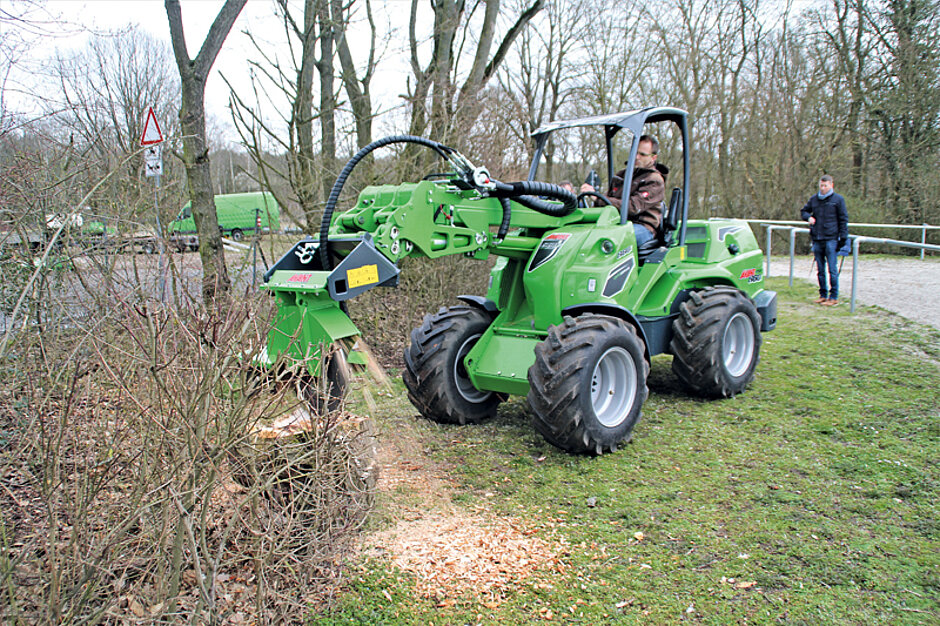 Für die Park- und Forstarbeit bietet Avant den neuen Holzgreifer HD für Ast- oder Pfostenbündel, große Steine und auch Baumstämme. Als interessant für den Garten- und Waldbereich gilt auch die überarbeitete Baumstumpffräse von Avant. Ausgerüstet mit einem Schneidrad von 540 mm Durchmesser und 20 austauschbaren Zähnen wartet sie mit hoher Arbeitskraft auf. Jeder Zahn verfügt über drei Schneiden. Wird eine Schneide stumpf, lässt sich der Zahn drehen und eine neue scharfe Kante steht für die Arbeit zur Verfügung. Gefräst wird durch Vorwärts- und Rückwärtsbewegung, die über die Fußpedale oder mit der Kippbewegung der Geräteanbauplatte gesteuert wird. t