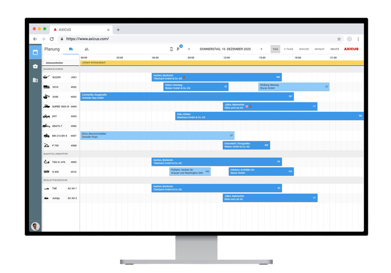 Dienstleister in der Baubranche planen ihre Baumaschineneinsätze mit Bedienpersonal digital im DispoManager und können künftig per Mausklick die Maschinenauslastung über das zentrale AXICUS Buchungsnetzwerk erhöhen und neue Kunden gewinnen. AXICUS deckt den Alltag eines Disponenten ab und bietet eine effiziente Lösung für die Verwaltung aller Aufträge, die kurzfristige Vermittlung neuer Maschineneinsätze und die automatische Übermittlung von Einsatzdetails an das Bedienpersonal und den Bauleiter der Kunden.