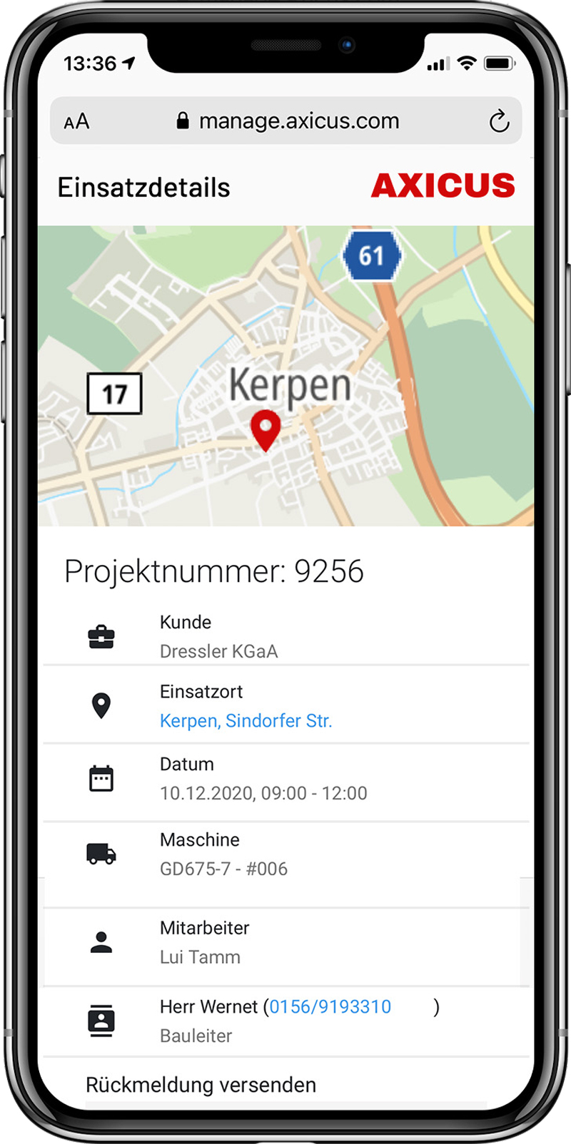 Nach dem Speichern des Auftrages wird der Auftraggeber automatisch über den Eingang des Auftrags informiert und kann in seinem AXICUS-Kundenkonto jederzeit alle Einsatzdetails zum Auftrag in Echtzeit einsehen. Per Mausklick kann der Disponent den Maschinisten und den Polier vor Ort über den bevorstehenden Einsatz benachrichtigen. Per SMS wird ebenfalls ein Link versendet, über den alle wichtigen Einsatzdetails abgerufen werden können. Die Einsatzdetailseite ist über ein Live-System in Echtzeit aktualisiert, sodass auch kurzfristige Änderungen des Einsatzes durch den Disponenten jederzeit für alle Beteiligten zur Verfügung stehen. Im Übrigen reduziert diese Funktion auch die Anzahl der Telefonate des Disponenten und die gewonnene Zeit kann gewinnbringender investiert werden.