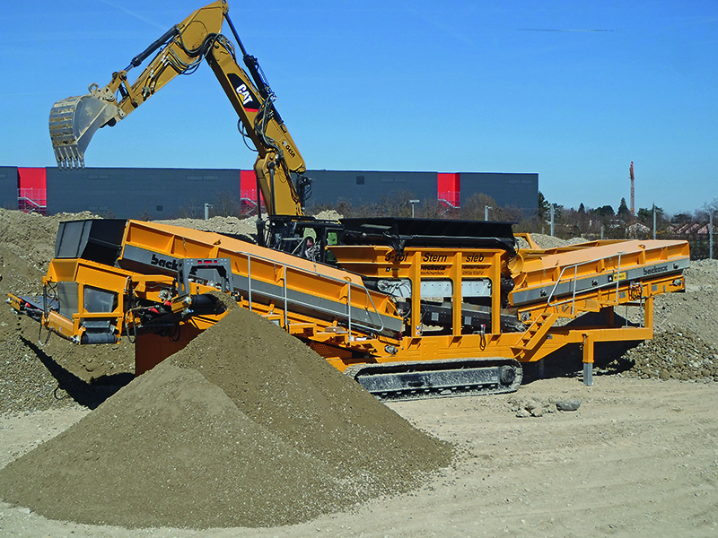Wenn der Boden zusätzlich aufgewertet werden soll, kann aus dem 3-Fraktionen-Sternsieb eine Sieb- und Mischmaschine entstehen, indem anstelle des feinen Siebdecks ein Bindemittelbehälter aufgesetzt wird. In dieser Ausführung wird der Boden dann gesiebt und stabilisiert. Die Bodenfestigkeit wird mittels Bindemittelmenge auf den gewünschten Bodendruck eingestellt. Im Anschluss könnte das Materialgemenge mit feinerer Körnung gesiebt werden. Die Leistung beim Sieben bzw. Stabilisieren von Böden kann nach Anbieterangaben rund 200 t/h bis 300 t/h betragen. Boden-Recycling mit exakter Bindemittelzugaben ist damit nicht nur hinsichtlich der Umwelt sinnvoll, sondern rechne sich auch, so Backers. Mit weiterer Zusatzausrüstung kann die Maschine zudem Flüssigboden produzieren.