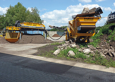 Das Sternsieb ist in der Neigung einstellbar. So ist die Siebintensität in einer Bandbreite regelbar und die Maschine kann in hügeligem Gelände arbeiten. Das Sternsieb 2-ta verfügt neben Grizzlyscreen über ein, bei 45 mm arbeitendes, Sternsieb. Es befindet sich nach Anbieterangaben derzeit in Kombination mit 10 mm Beistellsieb, Windsichtung und Magnet für die Reinigung von mineralischem Bauschutt im Test. Die komplette Anlage wird in dieser Betriebssituation per Sternsieb 2-ta angetrieben. §