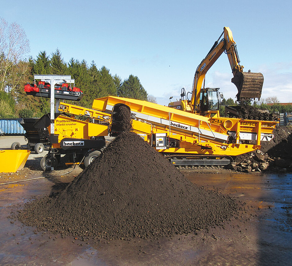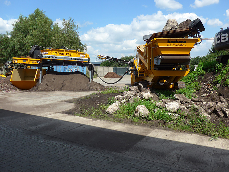 Insbesondere im Bodenrecycling, aber auch beim Recycling von mineralischem Bauschutt verspricht diese Kombination besondere Einsatzvorteile. Der Feinanteil 0 – 45 mm kann dann mittels Reinigungseinheit aufbereitet werden. Der Materialstrom (0 – 45 mm) wird an eine Reinigungseinheit weitergeleitet. Brechsand wird bei 8 – 10 mm abgesiebt, zugleich wird dadurch der Feinanteil in der Gutfraktion gemindert. Hinter dem feinen Sieb saugt ein Windsichter Leichtstoffe aus der Gutfraktion und am Ende des nachfolgenden Förderbandes wird Eisen entfernt.