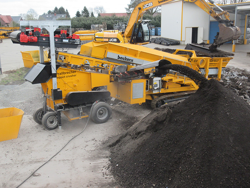Der Grizzlyscreen des Unternehmens aus Twist besteht aus einseitig gelagerten, rotierenden Walzen und trennt grobes Material bereits direkt bei der Materialaufgabe. Der Feinanteil 0 – 150/300 mm wird dabei bereits aufgelockert und dem Sternsieb vom Bunker aus übergeben. Siebt das Sternsieb beispielsweise bei 45 mm, kann der gereinigte Anteil 45 – 150/300 mm danach dem Prallbrecher 1010 mit E-Antrieb übergeben werden. Eisen wird durch einen Überbandmagneten vor dem Einlass des Prallbrechers separiert und kann bei 60 – 80 mm grob gebrochen werden, weil das gebrochene Material »im Kreis gefahren« wird.