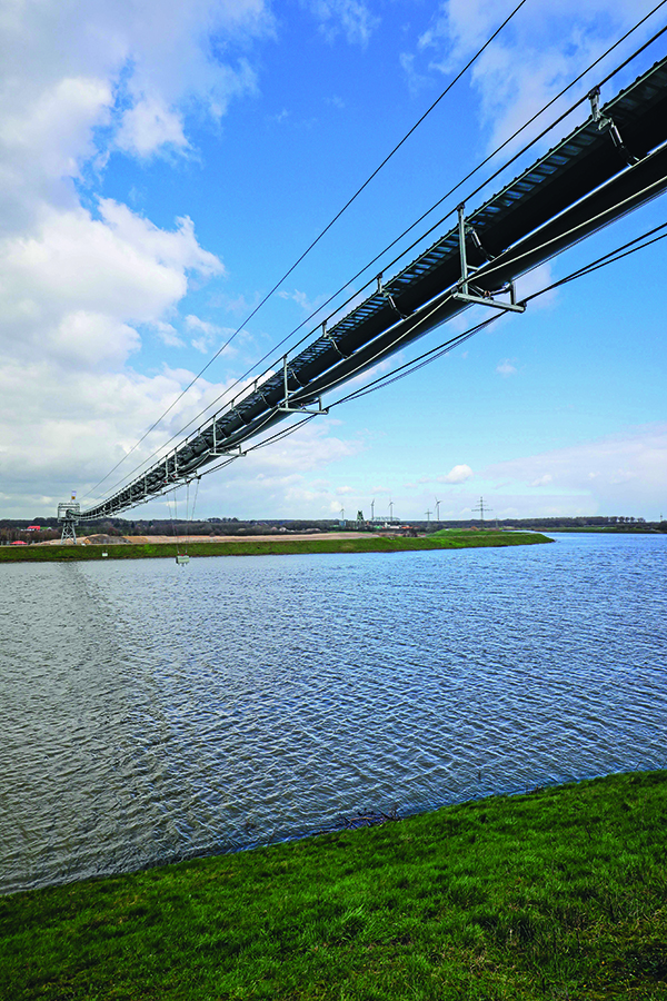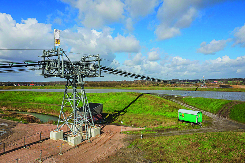 Das auch im Skiliftbau erfolgreiche Unternehmen Leitner setzt für das »HaLiMa«-Projekt auf ein 80 cm breites Förderband, das mittels zweier Pfeiler die Lippe im Übergang vom nördlichen Ruhrgebiet zum südlichen Münsterland überspannt. Die Förderanlage, die mit der speziell errichteten Aufnahmestation für Baumaterial verbunden ist, wurde auf eine Leistung von bis zu 500 t/h ausgelegt und macht vergleichbare Lkw-Transporte zur anderen Flussseite unnötig.