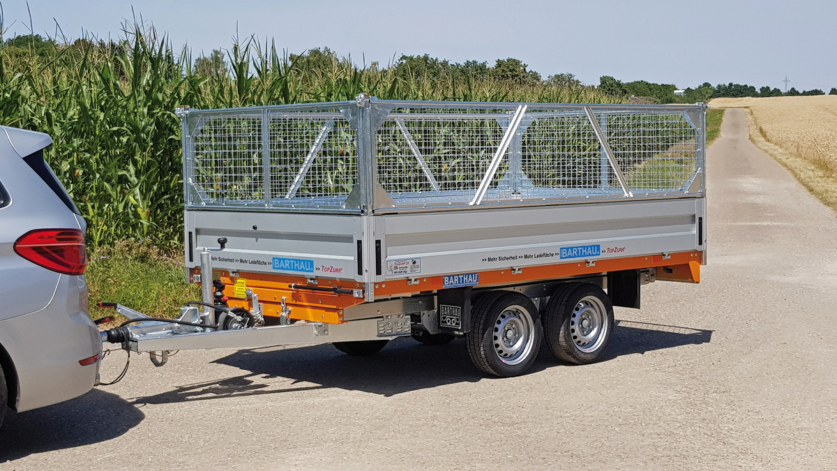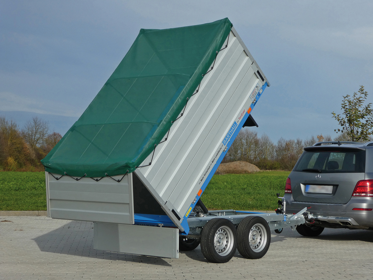 Mit 2,51 m x 1,56 m bis 3,01 m x 1,7 m und einer Bordwandhöhe von 350 mm sowie Gesamtgewichten zwischen 1 500 kg und 2 700 kg ist er als Standardkastenanhänger für verschiedenste Materialtransporte geeignet. Dabei kommt vor allem sein spezielles Ladungssicherungssystem Topzurr 21 zum Tragen, das eine »kinderleichte« Sicherung verspricht. Mit dem Schließen der Bordwand ist der Gurthaken gesichert und kann laut Barthau hohen Belastungen ausgesetzt werden. Das Zurrprofil und Gurthaken wurden auf 400 daN (kg) geprüft, in Anlehnung an DIN 75410-1, auch wurde hierfür das GS-Zeichen verliehen.