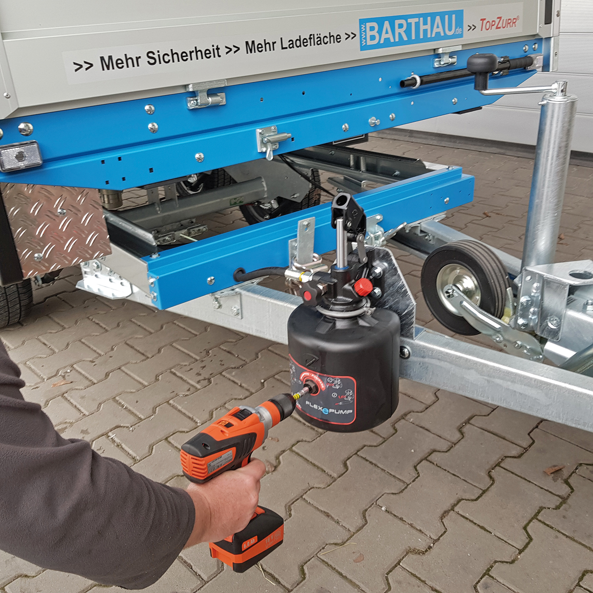 Gegen Mehrpreis können die Rückwärtskipper auch mit einer Akkupumpe ausgerüstet werden. Die Pumpe wird mit einem Akkuschrauber mit mindestens 18 V betätigt und ermöglicht das leichte Abkippen ohne manuelles Pumpen. Sand, Steine, Schutt und anderes Schüttmaterial lassen sich so transportieren und abladen.