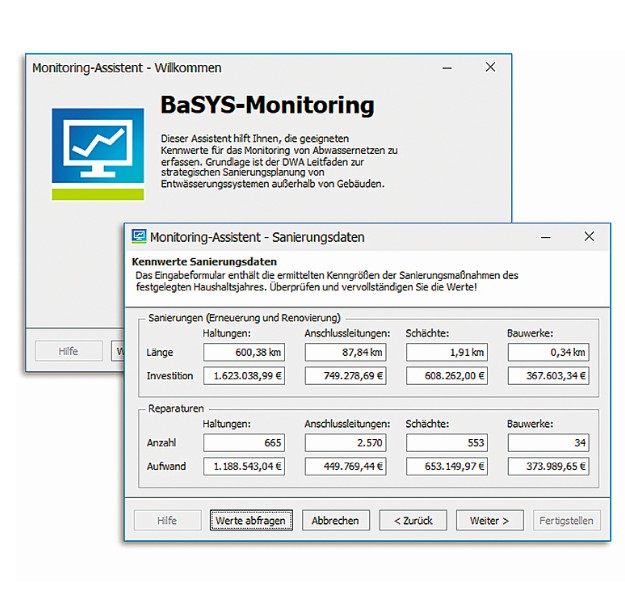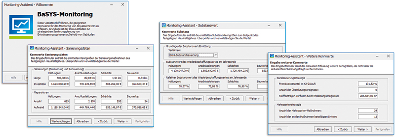 Das Basys-Monitoring-Tool ermöglicht eine automatisierte Abfrage der erforderlichen Kenngrößen und speichert diese datumsbezogen in einer Datenbank. Der Monitoring-Assistent führt den Anwender durch die Kenngrößen-Eingaben für die Stamm-, Vermögens-, Zustands-, und Substanzdaten, sowie Investitionen der Reparaturen, Renovierungen und Erneuerungen. Durch gezielte Abfragen ermittelt Basys-Monitoring die Kenngrößen fachbereichsübergreifend.