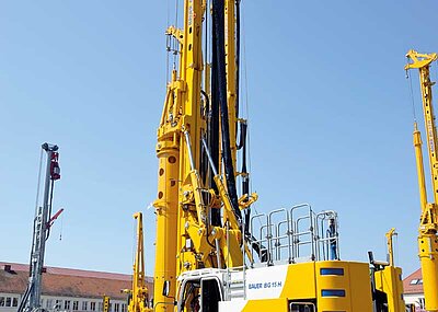 Mit der BG 45 zeigt Bauer ein bewährtes Premium-Line-Gerät der oberen V-Geräteserie. Die Maschine ist mit einem weiterentwickelten Bohrsystem zur Erstellung von tiefen Vollverdrängerpfählen im LostBit-System ausgestattet. Das Trägergerät BS 95 ist mit einem speziellen Ausrüstungspaket dafür vorgerüstet.