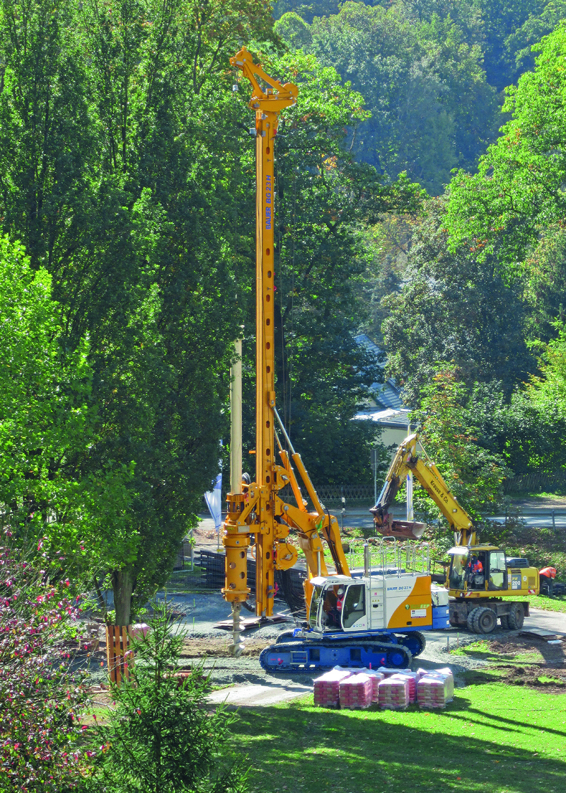 RTG Rammtechnik – seit über 20 Jahren Teil der Bauer-Maschinen-Gruppe – zeigt am Stand mit der RG 27S und der RG 19 T seine Geräte ebenfalls in einer »Baustellensituation«: Die RG 27S ist ausgerüstet für das CSM-Verfahren; die RG 19 T mit ihrem schallisoliertem Rüttler SilentVibro MR 150 AVM ist für das Einbringen von Spundwänden ausgestattet. Zwischen beiden Geräten ist ein VdW 50/100 von Eurodrill zur Herstellung einer überschnittenen Bohrpfahlwand »im Einsatz«.