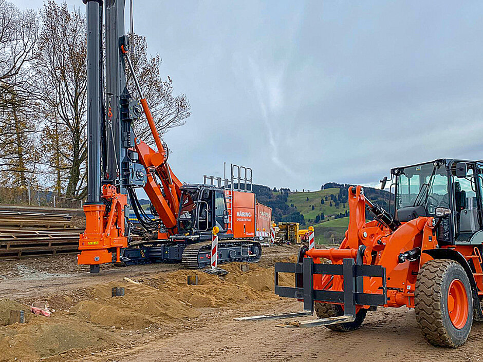 Dazu wird mit dem BG 20 das Bohrrohr an die gewünschte Stelle gesetzt, dann mit einem Drehmoment von 200 kNm nach unten durch bindige und lehmige Bodenschichten gebohrt, anschließend der rund 1,9 t schwere Stahlträger eingesetzt und mit Beton und hydraulisch gebundenem Material verfüllt. Dafür kommt ein Cat-Radlader 910M ins Spiel, der dem Bohrgerät mit seiner Seitenkippschaufel zuarbeitet und für Nachschub an Verfüllgut sorgt.