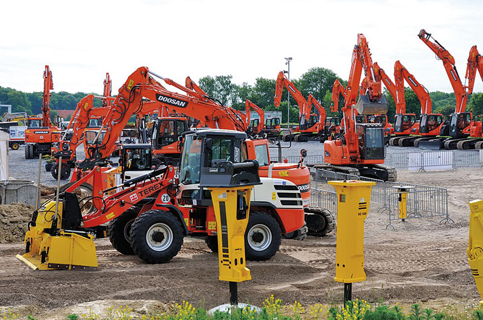 Auf dem Vorführgelände war eine große Musterbaustelle eingerichtet, wo sich die Fachbesucher von den neuen Maschinen und Anbaugeräten überzeugen konnten. Terex war mit seinem Demopool an Minibaggern der neuen Generation angereist und hatte auch Berater und Vorführer im Gepäck, die die neuen Maschinen im Einsatz zeigten und mit dem Kraemer-Team Fachfragen en detail beantworteten. Die großen Maschinen von Doosan wurden von den Kraemer-Spezialisten gefahren, die einige Tricks und Stunts zeigten, um die Agilität und Kraft der Maschinen zu demonstrieren, konnten aber auch von Fachbesuchern bewegt werden. Ebenfalls präsentiert wurde die neue Radlader-Palette von Yanmar mit bewährter Technik.