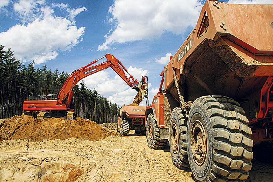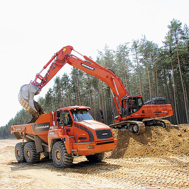 Rühle Maschinenpark stellte die fünf Großmaschinen innerhalb von zehn Tagen bereit. Dazu Geschäftsführer Achim Rühle: „Natürlich hatten wir auch keine vier Muldenkipper zur freien Verfügung auf dem Hof stehen, doch als Doosan-Händler konnten wir auf Maschinen aus dem Doosan-Mietpark zurückgreifen und so die Anforderung unseres Kunden erfüllen.« So wurde beispielsweise der DX490LC-3 direkt von der diesjährigen Bauma auf die Baustelle geliefert. Im Doosan-Maschinenpark steht eine Reihe von Maschinen den Händlern zur Miete zur Verfügung. So können sie auch ohne hohe Investitionen jederzeit auf Kundenanfragen, auch zu Maschinen die sie nicht selber im Mietpark haben, reagieren.