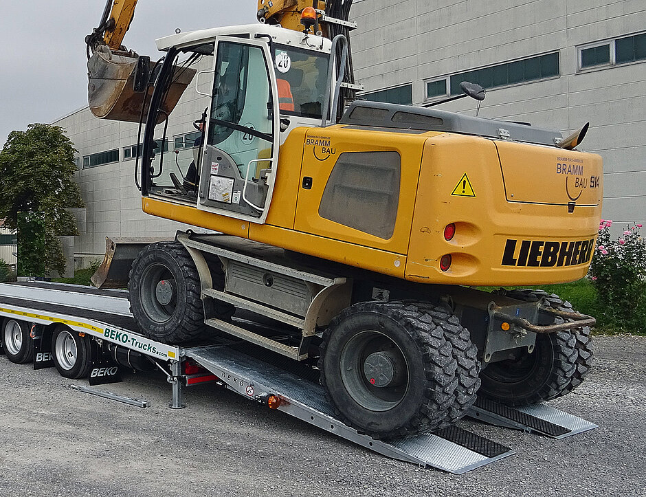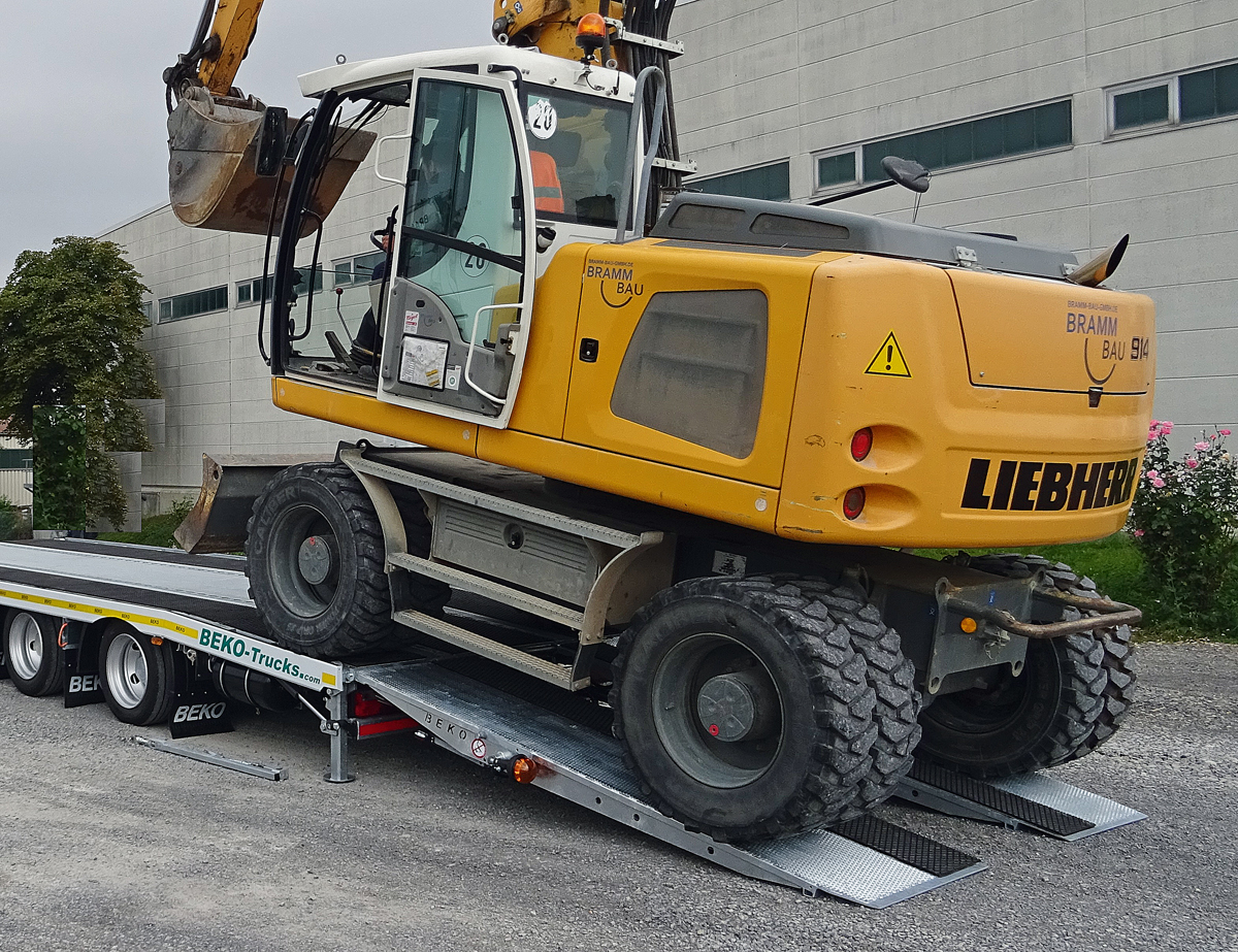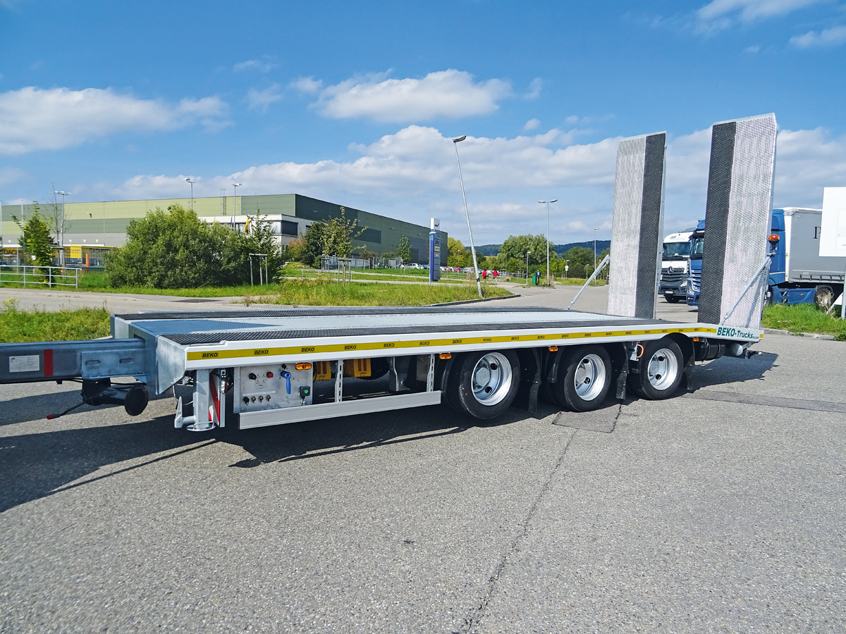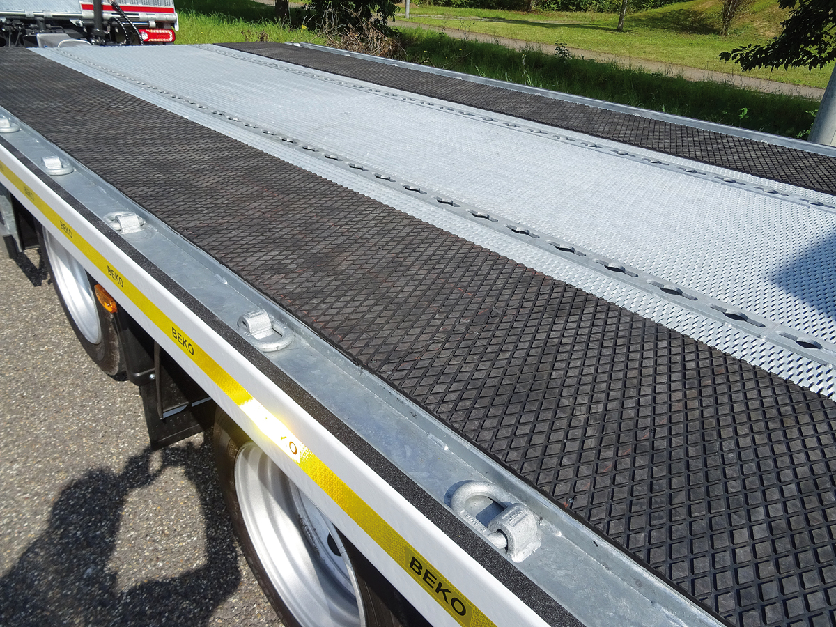 Im Einsatz will sich der Tridem 25 als besonders wendig erweisen. Als Grund dafür nennt der Hersteller die Ausstattung des Dreiachs-Aggregats mit einer Lenkachse. Im Leerfahrt- oder Teillastbereich erhöht die Liftachse zusätzlich die Wendigkeit des Tridem-Anhängers. Dass es sich bei der Neuheit um einen »echten« BEKO-Anhänger handelt, soll man auf den ersten Blick an den Zurrschienen erkennen können, die in den Mittelbereich der Ladeflächenabdeckung integriert sind. Zusätzliche Zurrösen am Außenrahmen bieten ein umfangreiches Angebot an professioneller und vorschriftsmäßiger Ladungssicherung. Der seitliche Ladeflächenbelag besteht aus einem Hartgummibelag, der den Tieflader nicht nur beim Befahren mit Kettenfahrzeugen schützt, er bietet auch gleichzeitig dem Transportgut einen sicheren Halt.