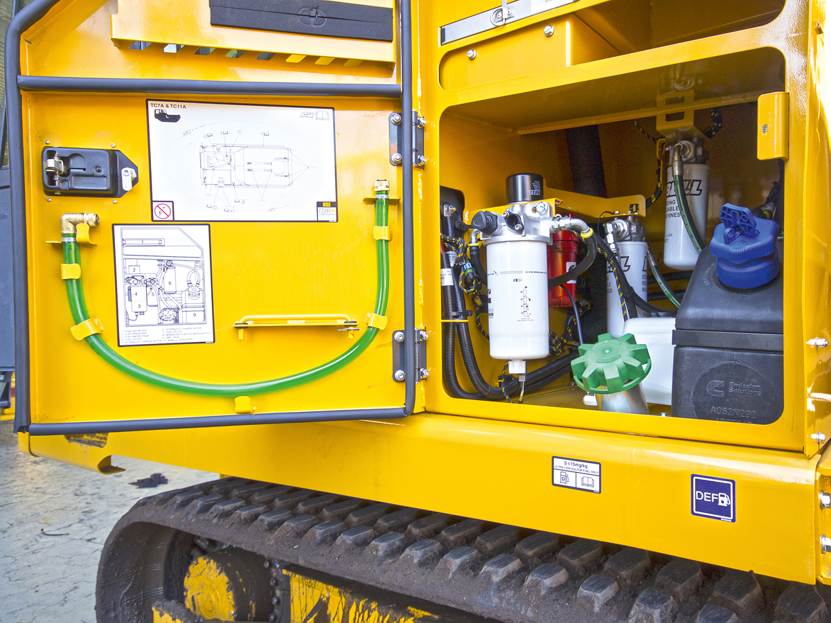 Über die Wartungsklappe auf der linken Seite der Maschine sind die Wartungspunkte vom Boden aus erreichbar. Zusätzlich verfügt der Bell-Raupentransporter über Kunststoffbuchsen in den Drehzapfen des Fahrgestells, was den Schmierbedarf reduzieren und den Verschleiß verringern soll.