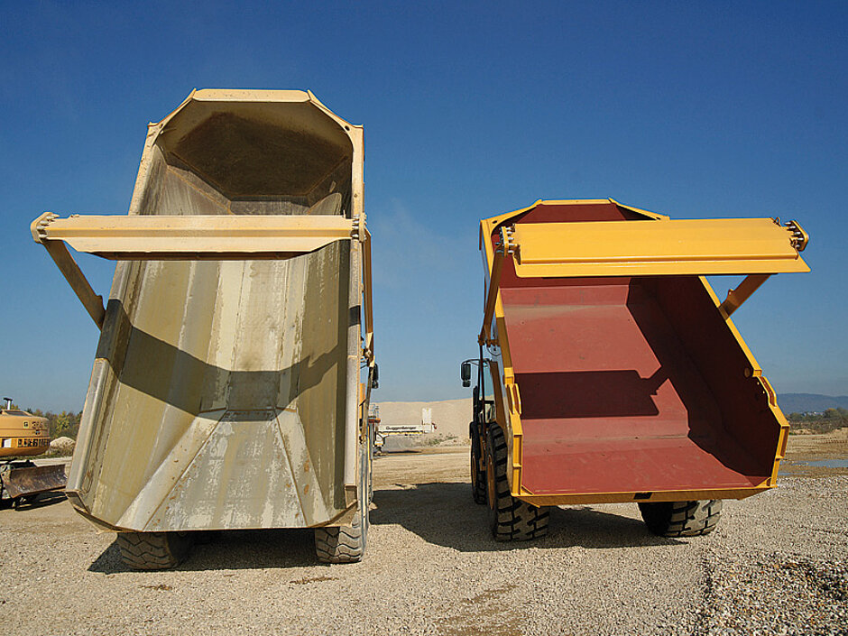 Mit nominell 28 t besitzt der Zweiachser die identische Nutzlast zum 6x6-Dreißigtonner – entsprechend hoch sind die Reserven der starr geführten 36-t-Hinterachse mit 29.5R25 Bereifung (vorne: 23.5R25). Zumal der neu gestaltete Muldenkörper mit flachem Boden mit 18,5 m³ (SAE 2:1) rund 1 m³ mehr Volumen bietet, als die V-förmige 6x6-Mulde. In Mintraching lädt der B30E 4x4 mit automatischer Heckklappe nochmals rund 1 m³ mehr, wobei die kurze Muldengeometrie insbesondere die Siloverladung leicht fließender Sande oder Kiese beschleunigt. Beim Entladen bringen die kürzeren Hydraulikzylinder schnellere Kippspiele – wichtiger für spezifische Anwendungen (Einhausungen, Untertage-Einsatz) ist allerdings die niedrigere Auskipphöhe, die der B30E 4x4 bei identischem, frei konfigurierbarem 70°-Kippwinkel gegenüber der konventionellen 6x6-Mulde benötigt. §