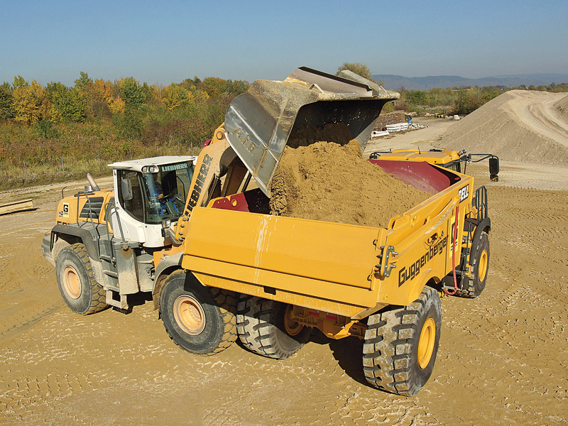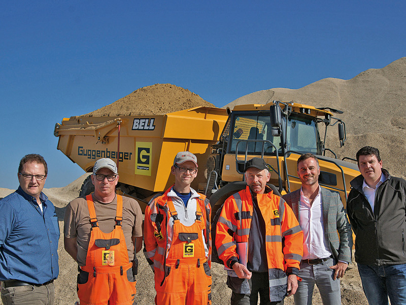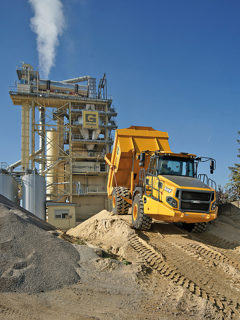 Bis Mitte 2017 fuhr unter anderem ein Bell B25D zwölf Jahre und rund 13 500 Betriebsstunden in Grube und Abraum sowie zwischen Siloabzug und Bunkern. Beim anstehenden Ersatz entschied sich Guggenberger wiederum für Bell – nach Evaluierung mit dem regional zuständigen Händler Beutlhauser Baumaschinen für den aktuellen Zweiachser Bell B30E 4x4, der unter den spezifischen Voraussetzungen eine noch bessere langfristige Wirtschaftlichkeit verspricht. Tatsächlich führen die bis zu 1,5 km langen Umläufe in Mintraching über gut ausgebaute Fahrwege, die keine 6x6-Traktion erfordern. Punktet der Allrad-Zweiachser schon hier mit geringerem Reifenverschleiß, spielt er im überwiegend engen Werksverkehr bei kürzerer Gesamtlänge und kleinerem Wendekreis seine Stärken richtig aus: Im direkten Vergleich zum Dreiachser B30E bietet der 4x4 rund 1,5 m weniger Wendekreis (14,6 m), dank deutlich kürzerem Hinterwagen mit neugestalteter Mulde erleichtert er das Rangieren erheblich. Ohne »radierende« Mittelachse werden zudem die Fahrwege zwischen den Halden geschont, was der schnellen Abfertigung eigener oder fremder Aufliegerzüge entgegen kommt.