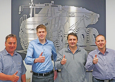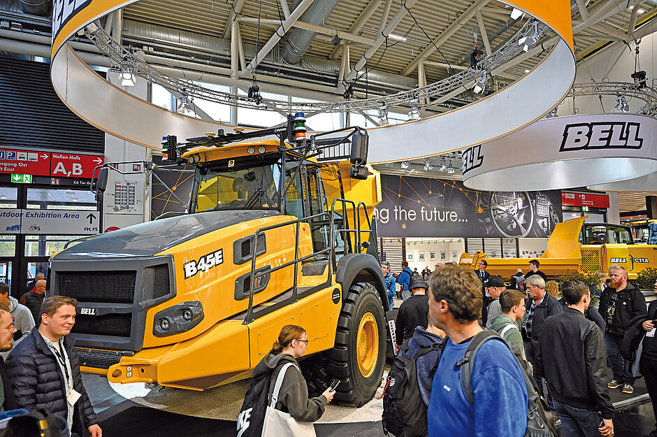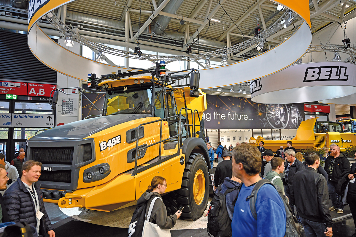 Premiere auf der Bauma feierte bei Bell Equipment der Raupentransporter TC11A, der über eine Nutzlast von 11 t verfügt. Die mit einem Kombibehälter – der sowohl als Kippmulde oder auch als Flachbett genutzt werden kann – ausgestattete Maschine wurde seit der Markteinführung in den vergangenen knapp zwei Jahren in Nordamerika äußerst positiv von den Kunden beurteilt, vor allem aufgrund ihrer herausragenden Fahreigenschaften im schwierigen Gelände. Für Europa plant Bell die Markteinführung des TC11A sowie dessen kleineren Bruders TC7A Mitte kommenden Jahres. »Neben der sehr guten Steigfähigkeit und Stabilität dank des Laufwerks mit sechs Laufrädern und zwei Tragschwingen, dem hydrostatischen Fahrantrieb sowie den extra entworfenen Fahrerhäusern nach ROPS/FOPS-Standard haben vor allem die Robustheit, der Bedienkomfort und die Wartungsfreundlichkeit überzeugt«, erklärte Bell-Produkt-Manager Brad Castle im Gespräch mit dem bauMAGAZIN. Ebenso für Aufmerksamkeit sorgte am Stand mit einem Betriebsgewicht von 31 t und einem Muldenvolumen von 25 m³ der Muldenkipper B45E. t