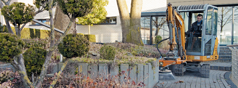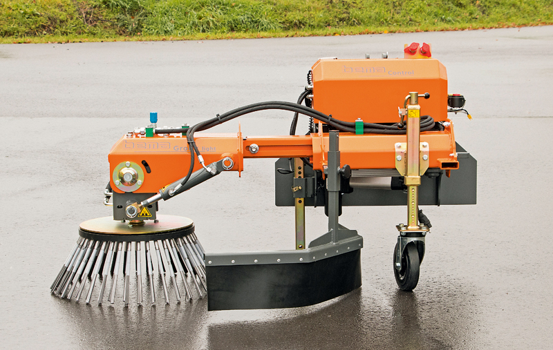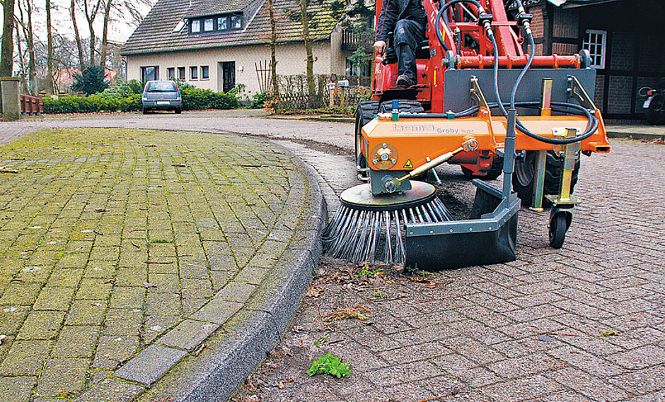 Unabhängig vom Trägerfahrzeug geht der bema Groby light die umweltschonende Grundreinigung an, um lästiges Wildkraut effektiv zu beseitigen. Der Kunststoffteller ist hierzu mit kunststoffummantelten Stahlflachdrahtbüscheln ausgestattet, die das Wildkraut aggressiv aus den Rinnen und Fugen herauskratzen.