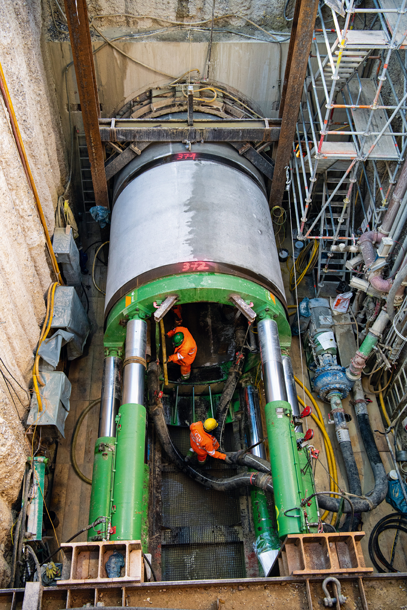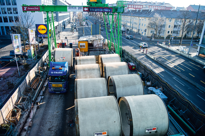 Auf der 2 195 m langen Vortriebstrasse wurden somit 735 Stahlbetonrohre im Vortriebsverfahren eingebaut. Besondere Herausforderungen bei der Umsetzung waren zum einen die Länge der Vortriebshaltungen und der Rohraußendurchmesser von 3 580 mm, aber auch die geologische Beschaffenheit des Baugrunds im Münchener Kies.