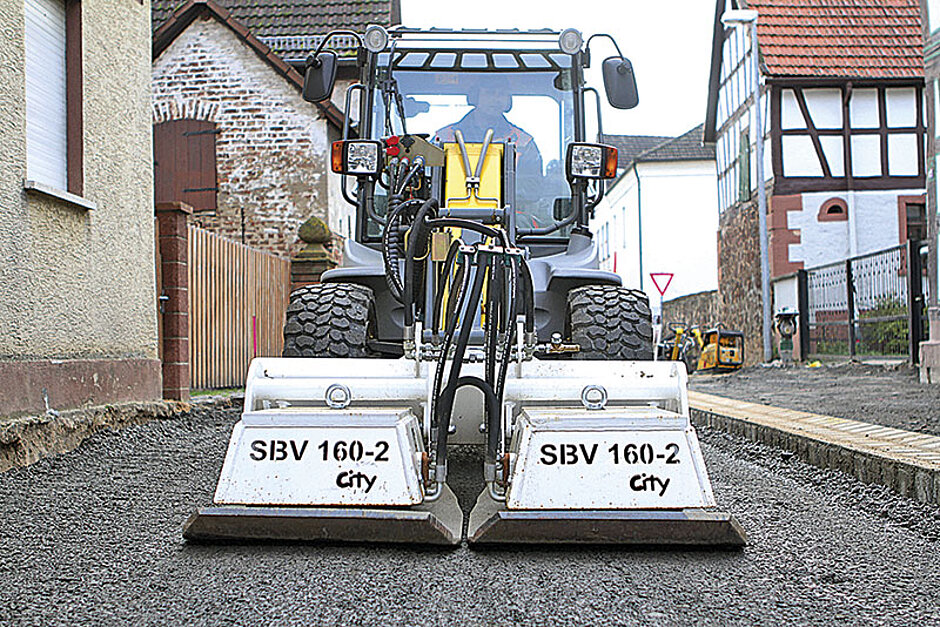 www.youtube.com/watch Unterbau aus gebrochenem Naturstein als Frostschutzschicht erfolgte auf einer Schicht aus sehr wasserhaltigem Sand und Schluff. Zu Beginn der Baumaßnahme beauftragte der Auftragnehmer ein Ingenieurbüro mit der Messung nach DIN 4150-3 erlaubten Schwingungen, die beim Verdichten entstehen. Die Maßnahme war notwendig, weil bereits vor dem Baubeginn Risse in einigen Hauswänden festgestellt worden waren und spätere Regressansprüche vermieden werden sollten. Schwingungen aller herkömmlichen Verdichtungsgeräte wie Walzenzüge und schwere Verdichterplatten wurden gemessen, dabei entsprach kein Verdichtungsgerät den geforderten Kriterien. »Nachdem einige Maschinen auf der Baustelle getestet wurden, konnte nur der Stehr-Plattenverdichter SBV 160/2 mit einem Kramer-Lader eingesetzt werden, der schwingungsarm, aber noch mit einer sehr guten Verdichtung und Flächenleistung arbeitet«, berichtet ein Vorarbeiter der Firma Strassing-Limes.