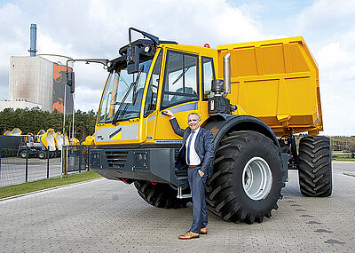 Wie so oft, sind auch bei dieser Baustelle im öffentlichen Raum die Platzverhältnisse sehr eng. »Für den Transport von Erdreich, Abbruchmaterial und Fräsgut war der kompakte Bergmann 3012 Rplus die richtige Wahl«, ist Polier Karol Domnik überzeugt. »Bei dem torfigen Untergrund würde ein Lkw steckenbleiben. Der kraftvolle Dumper dagegen nimmt mühelos selbst schweres Gelände unter die Räder.« Er ist nicht nur leichter als ein Lkw, auch der emissionsarme 119-kW-Cummins-Motor überzeugt mit einer hohen Durchzugskraft. Das Knickpendelgelenk unterstützt die besondere Wendigkeit und Standsicherheit des Dumpers.
