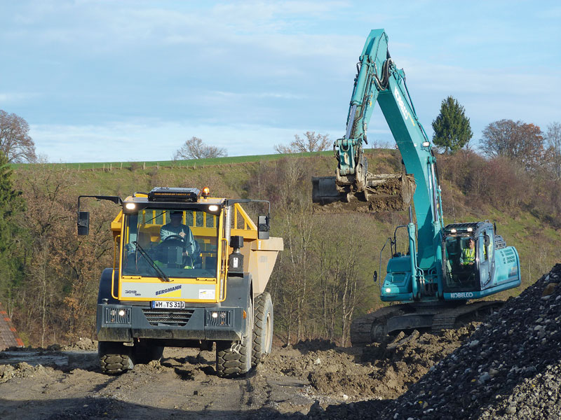 »Die Jungs haben richtig Spaß im 3012«, fasst Domnik die Meinungen der Kollegen zum Fahrzeug zusammen. Der Bergmann-Dumper der neuen Generation bietet einiges, was das Arbeiten erleichtert: So sorge der um 180° drehbare Fahrerstand – einzigartig in der 12-t-Dumperklasse, wie Bergmann unterstreicht – nicht nur für eine gesündere Sitzhaltung des Fahrers, sondern auch für mehr Sicherheit und höhere Transportleistungen. Wendemanöver oder das Zurücksetzen mit Blick in den Rückspiegel entfallen. Dank Drehsitz ist der Dumper im Rückwärtsgang bei besten Sichtverhältnissen im Arbeitsbereich mit einer Spitzengeschwindigkeit von gut 30 km/h unterwegs.