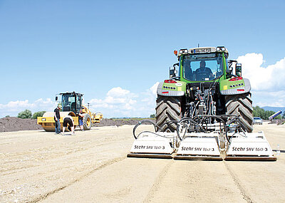 Aber auch die üblichen Planierarbeiten gehen mit dem Stehr-Patent jetzt deutlich leichter und schneller – der umtriebige Firmenchef spricht von einer Revolution in der Planierung, die bei manchen Einsätzen bis zu fünfmal schneller zum Ergebnis führe als mit dem herkömmlichen Equipment: »Ganz einfach weil zahlreiche Überfahrten wegfallen, die nicht nur Zeit kosten, sondern auch unnötige Betriebsstunden auf den Zähler bringen und damit auch eine Menge Sprit kosten, mehr schädliche Abgase und wesentlich mehr CO₂ erzeugen.«