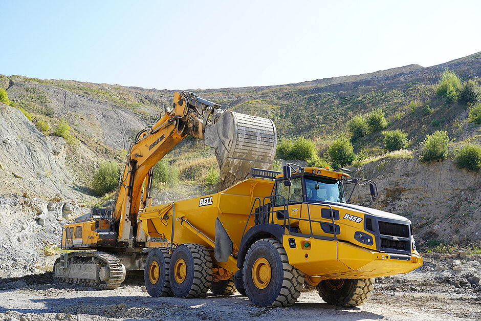 Die reichen Kalksteinvorkommen im Lauterbacher Graben sind ein echter Bodenschatz – und deshalb gut geschützt. Zur Gewinnung des Kalks muss zunächst eine Deckschicht „aus dem Weg geräumt“ werden. Genau hier kommt der neue knickgelenkte Muldenkipper von Bell ins Spiel. Er kümmert sich um den Abtransport des Keupers. Pro Fahrt können 41 t Material bewegt werden.