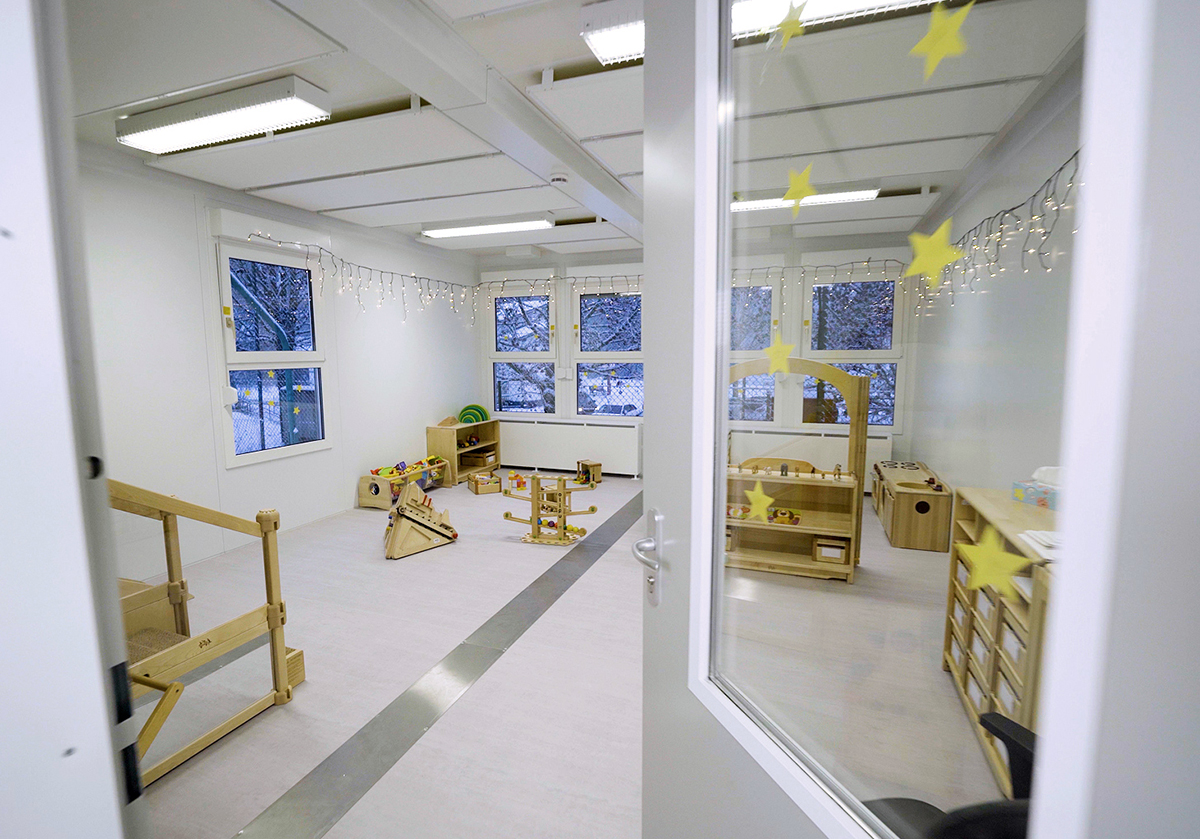 Die Anlage besteht aus 16 Einheiten mit einer Abmessung von je 6.055 mm auf 2.435 mm, die bis zur Fertigstellung des geplanten Neubaus für zunächst 24 Monate bei Beutlhauser angemietet wurden. „Die lichte Raumhöhe liegt bei 2.500 mm. So kommen wir auf eine Bruttofläche von 224 Quadratmetern. Das Platzangebot ist in Ruheräume, Gruppenräume und sanitäre Einrichtungen unterteilt“, erklärt Markus Ott von Beutlhauser Raumsysteme. Ott verweist zudem auf die hohe Qualität der Anlage und stellt einige Ausführungsdetails vor. Ballwurfsichere Lampen, elektrische Heizelemente mit geringer Oberflächentemperatur und Verbrennungsschutz, akustik- und schallabsorbierende Decken, Kindergarten-Fenster mit spezieller Verglasung und kindgerechte Sanitäreinbauten sowie WC-Kabinen sollen zur sicheren Umgebung der Kinder beitragen. Bei der offiziellen Einweihung mit Segnung der Räume wünschte Ott den Kindern viel Spaß beim Einrichten und Dekorieren ihres neuen „besonderen“ Kindergartens.