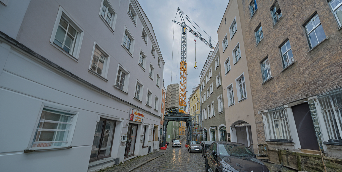 Einsatzleiter Christian Plettl berichtet: »Der Kran auf Portal ist gerade für beengte Umgebungen ideal, weil Platz eingespart wird und es dadurch möglich wurde, in der Passauer Altstadt einen Kran auch für längere Bauzeiten zu stellen. Zudem konnten wir mit dieser Lösung die Vorgabe der Stadt Passau, wonach der Verkehrsfluss während der Montage und der anschließenden Sanierungsarbeiten so gut wie möglich sichergestellt werden sollte, gewährleisten.«