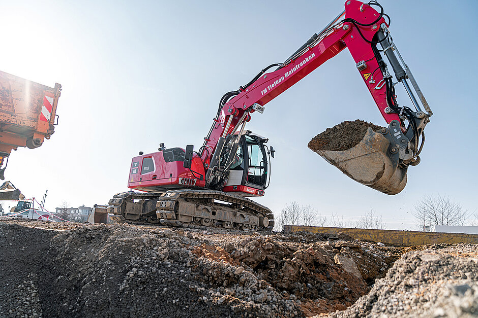 Allen voran wurde die Baumaschinenflotte um den Liebherr-Raupenbagger R 918 in der Sonderlackierung RAL 3000 erweitert. Der Bagger kommt bei TM Tiefbau Mainfranken zum Einsatz, einer 2019 neu gegründeten Tiefbausparte bei Riedel Bau. »Bis dato waren wir fast ausschließlich im Hochbau tätig. Nun steigen wir immer mehr in den Tiefbau ein und machen auch Erschließungen«, erklärt Peter Zitterbart, Leiter des Fuhrparks und des Logistikzentrums bei Riedel Bau, den Grund für die Neuanschaffung.