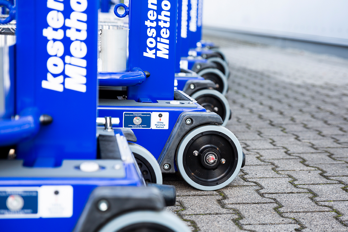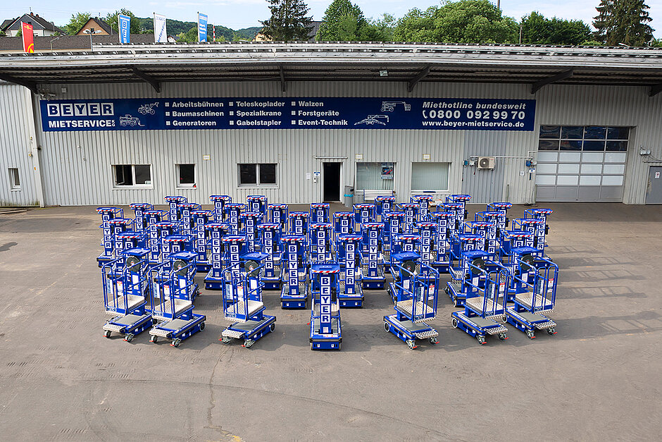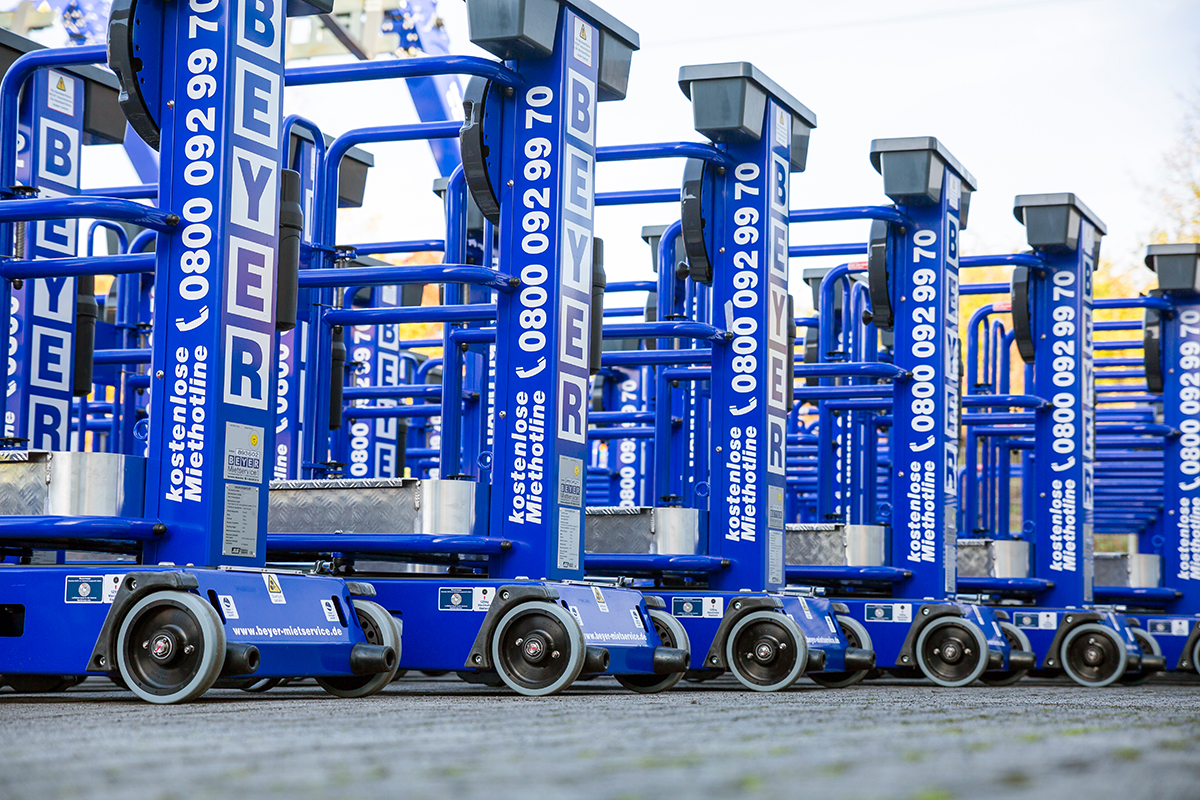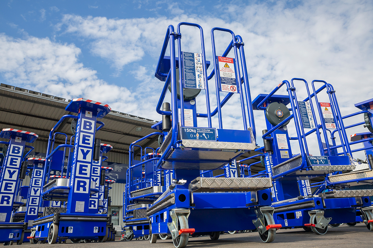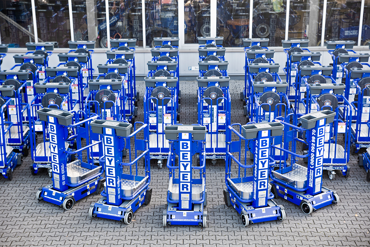 Mit einem weiteren, 100 Arbeitsbühnen umfassenden Anschaffungspaket bietet Beyer-Mietservice Kunden ein neues Mietsegment: rein mechanische Höhenzugangstechnik. Das erweiterte Angebot umfasst dabei jeweils 50 manuelle JLG Low-Level Bühnen der Bauarten PecoLift und EcoLift mit 3,50 m bzw. 4,20 m maximaler Arbeitshöhe.