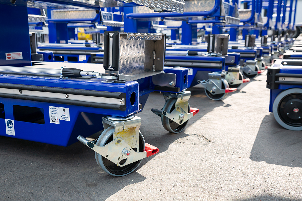 Genauso unkompliziert lassen sich individuelle Einsatzstellen in Innenräumen erreichen. Beide Bühnenarten messen nicht mehr als 74 cm in der Breite, sind niedriger als 2 m, passen entsprechend durch schmalste Flure, jede Standardtüre und in Aufzüge. Sie lassen sich problemlos von einer Person über ebenen, befestigten Boden bewegen und aufgrund der stabilen Lenkrollen quasi auf der Stelle drehen und präzise um Ecken und Raumteiler rangieren. Mit 180 kg bzw. 305 kg sind die Bühnen sehr leicht und für lastlimitierte Böden, z.B. Teppiche, geeignet.