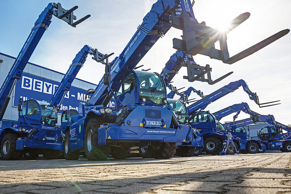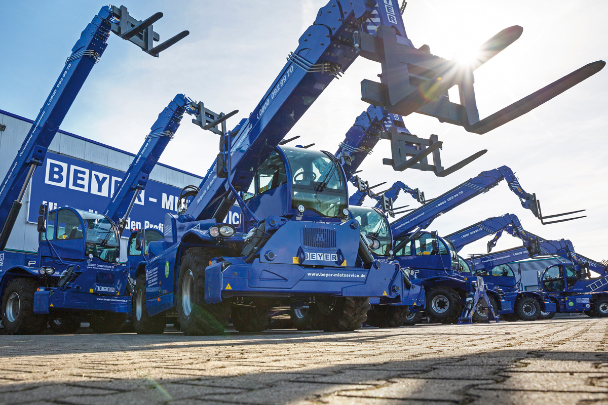 Einschließlich der jüngst eingetroffenen 25 Teleskopstapler starken Magni-Lieferung stockte Beyer-Mietservice sein Rotoren-Segment in den letzten drei Jahren um insgesamt 110 leistungsstarke Multifunktionsmaschinen auf. Das Gesamtpaket, das der Vermieter mit dem Hersteller schnürte, umfasst Dreher mit maximalen Hubhöhen bis 29,80 m und Tragkräften von maximal 7 t sowie eine umfangreiche Auswahl verschiedenster Anbauwerkzeuge. Die neuen Teleskopstapler punkten mit zuverlässiger Power, hochmodernen Bedienfeatures und innovativer Antriebstechnik. Der Anbieter setzt zudem seit längerer Zeit auf alternative Antriebstechnologien: So bringen die neuen Magnis nicht nur eine Stage V-konforme Motorisierung mit. Die Endlosdreher mit der Beyer-Bezeichnung TSR 2160, TSR 2670 und TSR 3060 sind optional mit einem Twin-Energy-System, einer neuartigen Plug-in-Technik für die elektrische Nutzung, aufrüstbar. d