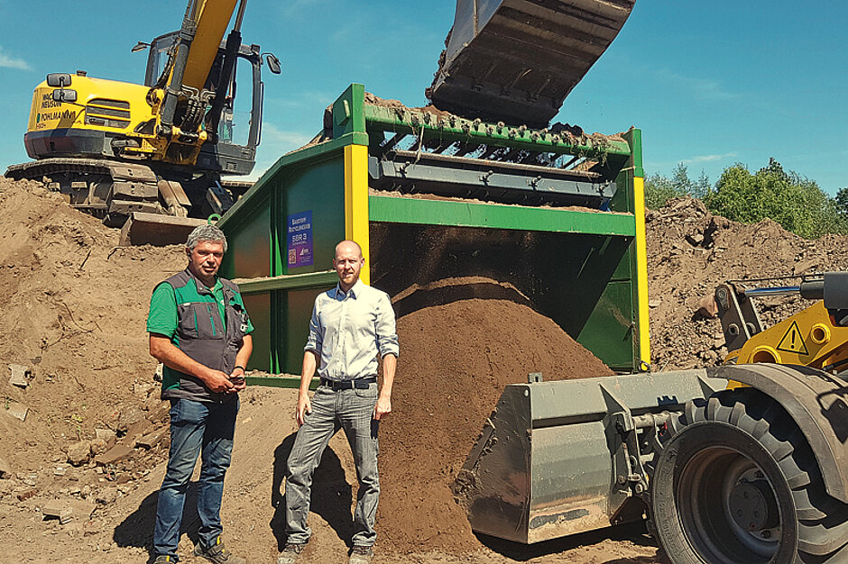 Bei einer Tiefbaumaßnahme hatte die Firma Pohlmann rund 16 000 m³ Baustoffe zu bewegen, 5 000 m³ davon aufzubereitender Aushub. Als GaLaBauer hatten Ludger Pohlmann und sein Team bereits früher ihr Können im Tiefbau nachgewiesen. Mit einem Siebdeck (20 x 20 mm Maschenweite) bespannt, wurde die SBR 3 von einem Kompaktbagger des Typs Wacker Neuson ET 145 beschickt und mit einem Radlader WL 70 geleert. Was sonst mit einer größeren Mietmaschine abgewickelt worden wäre, konnte so mit der eigenen Technik realisiert werden. Inklusive der Materialberäumung und Zuführung von Aushub zum Bagger, wurde mit einer Leistung von 80 t/h bis 100 t/h aufbereitet und feinster Mutterboden erzeugt. t