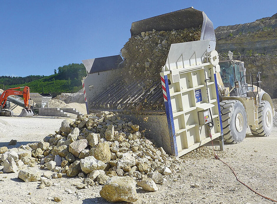 Die Beschickung des Baustoff-Recyclingsiebs SBR 2 erfolgt im Kalkwerk Weißer Jura mit einem Cat-Radlader des Typs 980, einem Modell der 30-t-Klasse. Florian Schmellenkamp, Leiter der Geschäftsentwicklung, war selbst skeptisch, als ihm Hartmut Koch-Czech, Geschäftsführer bei Eduard Merkle, sein Ansinnen auf der Steinexpo im letzten September vorgetragen hatte. »Die Maschine ist ausgelegt für Radlader um 4 m³ Schaufelinhalt, idealerweise mit einer Schaufelbreite von 3 m bis 3,2 m. Aber wir lassen uns gerne von unseren Kunden überzeugen, dass unsere Maschine auch mit 3,6 m breiten Schaufeln und bis zu 6 m³ Schaufelinhalt zu betreiben ist«, berichtet Schmellenkamp. Seit Anfang des Jahres ist die Maschine jetzt mit einer 80-mm-Quadratmasche in Blaubeuren im Einsatz und verhindert auf einfache Weise, dass verwertbares Material entsorgt wird.