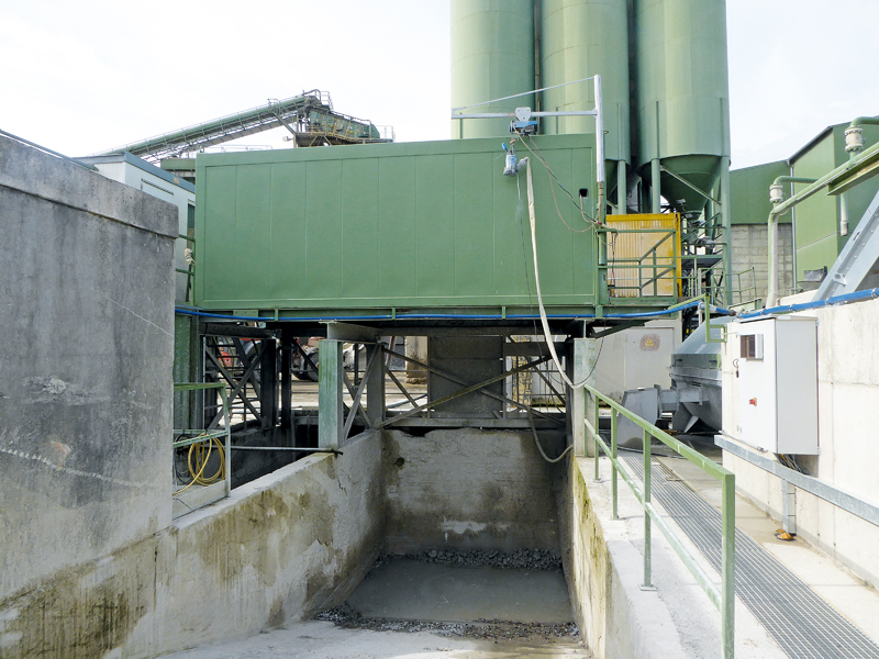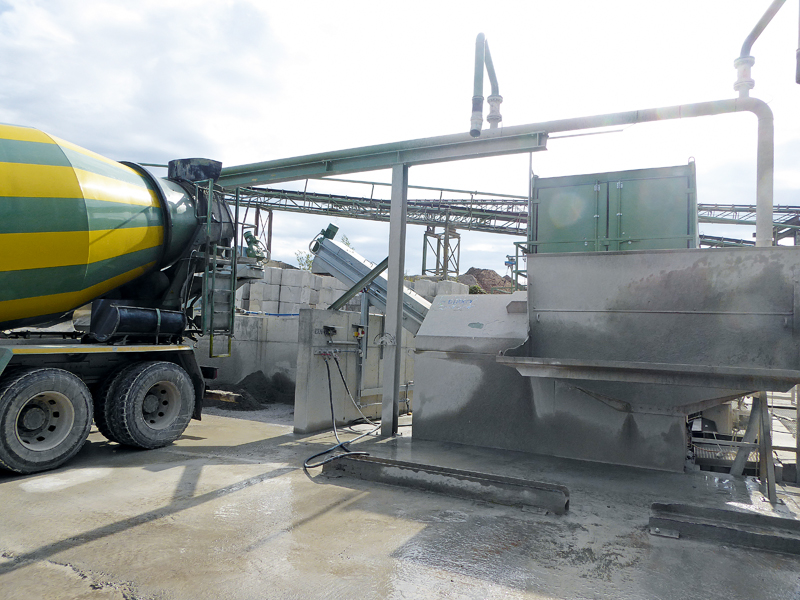Beide Systeme verfügen über je zwei Spülgalgen, die die Fahrmischertrommeln mit Recycling-Wasser befüllen. Der noch flüssige in der Mischertrommel enthaltene Restbeton wird mit dem aufgegebenen Recycling-Wasser in den Aufgabetrichter in einem der beiden Systeme ausgedreht und in der Recycling-Maschine in die Bestandteile separiert.