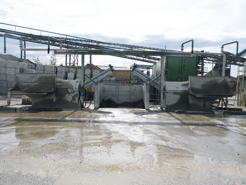 Das entstehende Waschwasser (maximale Feinteilkorngröße ≥ 0,2 mm) wird über eine Auslaufrinne dem Rührwerkbecken zugeführt, wo die Feinteile im Restwasser durch zyklisches Rühren in Schwebe gehalten werden und ein Absetzen der Feinteile verhindert wird.